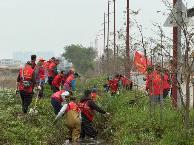下午3时,金湾区红旗镇清淤现场党旗飘扬、热潮涌动。简短动员后,人工清淤队伍分组有序进入作业区,党员干部带头挥锹铲淤,志愿者与村民群众分工协作,对300米农田灌排沟渠开展人工清淤疏浚;专业队伍调配2台机械设备,同步对约1000米农田灌排沟渠开展高效作业。机械轰鸣与人工劳作相互配合,志愿红、迷彩绿、机械蓝交相辉映,勾勒出全民参与、共治共享的生动场景。各区分会场同步发力,对辖区的农田灌排沟渠、截洪沟、小微水体开展清淤整治,全市形成“一盘棋”集中清淤联动格局。本次集中活动,全市各行动点累计清理沟渠2700米,清理淤泥及杂草约900立方米。“志愿红”已成为清淤战场上一道亮丽风景线,村居志愿者以“主人翁”姿态主动参与,成为清淤管护最可靠的中坚力量,为人水和谐的城乡画卷增添温暖底色。